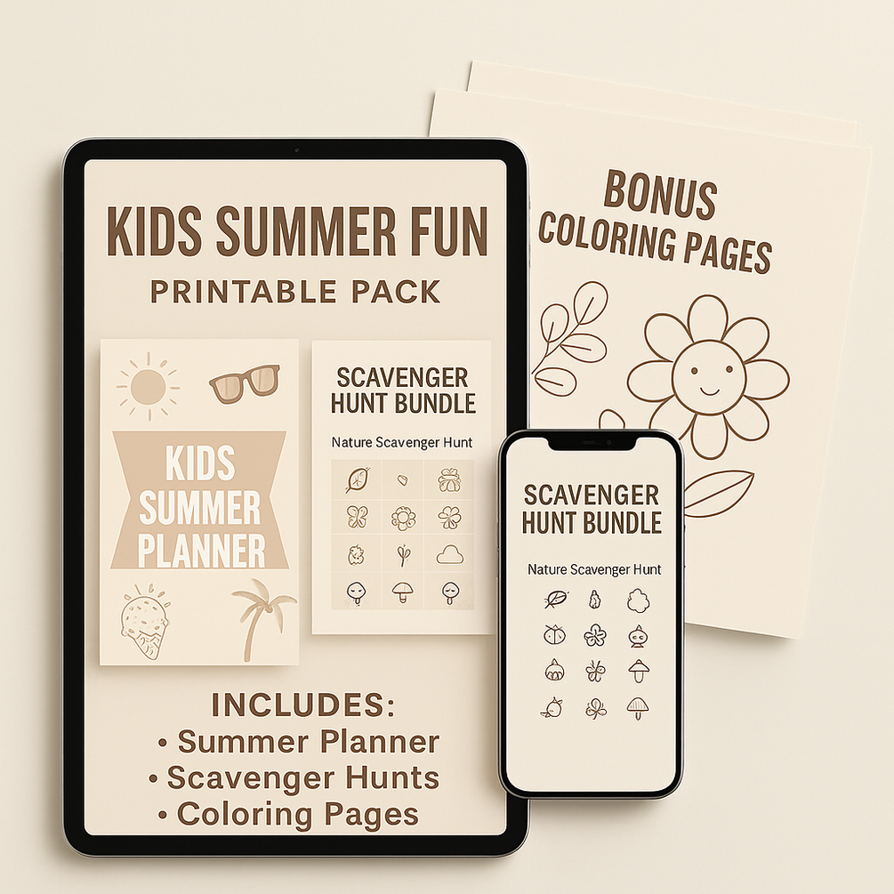 🗓️ Summer Planner for Kids • Daily & Weekly Schedule Templates • Goal Tracker, Reading Log, Habit Tracker • Journaling + Creative Prompts 🔍 Scavenger Hunt Bundle • 10 Fun Themes: Indoor, Nature, Beach, Alphabet & More • Comes in both card + checklist formats • Perfect for travel, backyard fun, or camp at home 🎨 Bonus Coloring Pages • 10+ creative pages • Originally Mother’s Day, now evergreen • Great for quiet time or calming afternoons